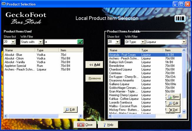 This form is used to browse product items from the master list and select items to be added to the local list used by the business. We recommend that you use the Bar Setup Wizard when doing a number of items.