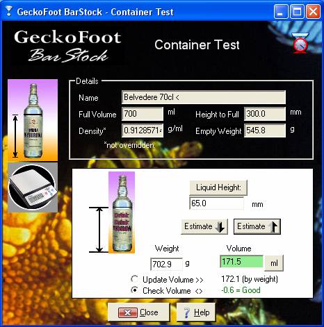 Density override is useful if the same containers are used for different products where the densities of the products are different. For Example: Each Monin, Bolls or De Kuyper liqueurs each come in the same style bottle for that brand but contain liquids of very different densities. This will affect weight to volume conversion. See the Measure Full Container section for more detail.