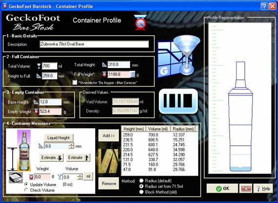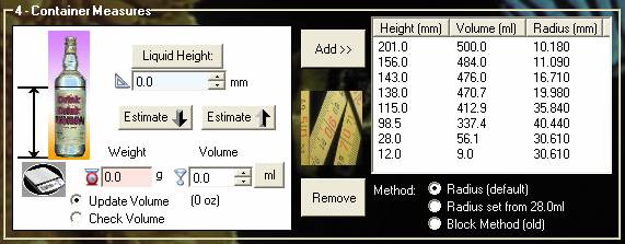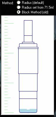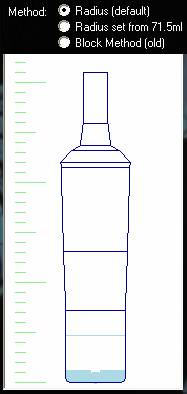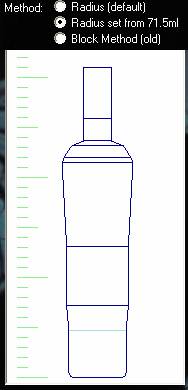 | Block Method | If the bottle or container has a very complicated shape you can revert to using more measurements and a block method which is generally less accurate. Please test thoroughly if you use this method. |