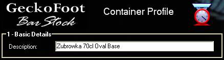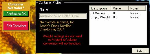 You will generally have one container profile for each shape of a bottle – different flavours of spirits often come in the same shape of bottle. Then when reusing that container for various flavours you can optionally override the full weight if the density of the product is different.