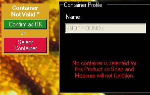 Once the product and item have been found or selected, if the item does not currently have a container profile associated with it this will be highlighted.