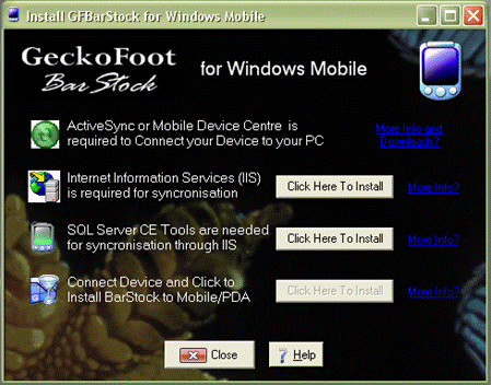 · Restart GeckoFoot BarStock and open the Install to Windows Mobile tool as the GFBarStockSQL directory is created here, and try http://localhost/gfbarstocksql/sqlcesa35.dll again.
