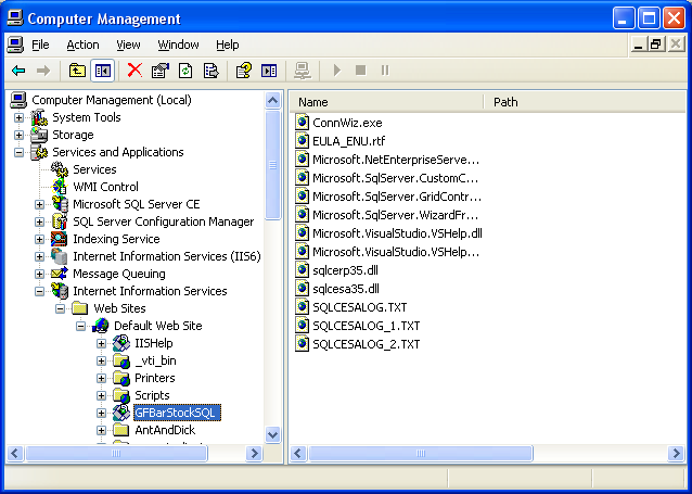 · Open IIS Manager found in Control Panel/Administrative Tools or in Computer Management - under “Services and Applications”. Check that the directory GFBarStockSQL exists and contains the sqlcesa35.dll file: